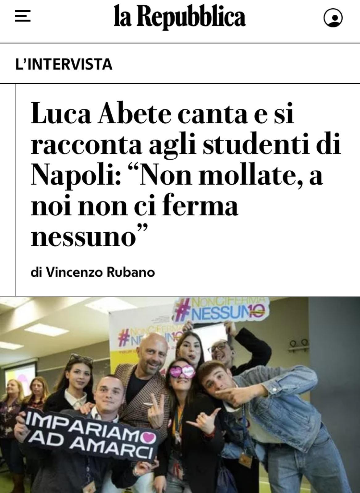 Luca Abete, 50 anni, quasi venti come inviato di Striscia la Notizia, il tg satirico di Canale 5 ideato da Antonio Ricci, si racconta agli studenti dell’Università Parthenope di Napoli e si improvvisa cantante per il suo tour motivazionale “Non ci ferma nessuno” nei maggiori atenei d’Italia. Non solo inviato, adesso anche cantante? “Ecco, questa me la sarei risparmiata. Ho trovato il coraggio di farlo solo per i giovani. Ho pensato che la musica potesse essere quella freccia diretta al loro cuore. Mi sono circondato di professionisti straordinari ed è nata “Impariamo Ad Amarci”, la colonna sonora del tour #noncifermanessuno". “Non ci ferma nessuno”: dieci anni di incontri e di emozioni… "Ogni talk è un volo nelle paure, nelle sensazioni che vivono tanti studenti italiani. Alcuni sono forti, hanno vissuto esperienze toste e le raccontano con disinvoltura. Altri respirano un’aria di solitudine. Provo a motivarli, a far capire loro che quella solitudine è solo percepita, non reale”. Come è nato questo progetto? "Spesso quando incontravo studenti per strada mi chiedevano come fossi arrivato a Striscia. Immaginavano favoritismi o raccomandazioni. Ma quando raccontavo la mia storia di impegno e di sacrifici ho scoperto che accendevo la loro attenzione e contribuivo a dissipare le paure. Così ho pensato di metter su un format: una campagna sociale motivazionale in cui non si parla solo di successo ma anche di sconfitte e il valore che possono avere se ben gestite. È stato subito un trionfo tra i ragazzi. Poi è arrivato il consenso del mondo accademico e la soddisfazione della medaglia del presidente Mattarella”. Cosa rappresenta per te Napoli? "Napoli è la città dove è nata e vissuta parte della mia famiglia. È il luogo dove ho studiato Architettura. È un viaggio in un mondo unico, sorprendente, travolgente. Per lavoro ne vivo le difficoltà che qui spesso assumono forme estreme. Essere al servizio di chi sogna di cambiarne i lati negativi è un privilegio. Non mancano i momenti difficili, ma son certo che solo eliminando il “brutto” si possa far emergere il ‘bello’”. Il tuo messaggio per gli studenti di Napoli? "Siate fieri delle vostre origini, di quello che siete, di ciò che hanno fatto illustri conterranei prima di voi. Partite da questi esempi per inseguire i vostri sogni, per affermare il vostro talento. Forse occorre lottare un po’ in più che altrove, ma non è una sfortuna! È solo palestra per diventare più forti e superare ogni ostacolo”. Quanto è importante denunciare le ingiustizie? E, soprattutto, conviene denunciare? "È fondamentale ma difficile. Spesso si temono ritorsioni. Per questo mi scrivono in tanti, anche in forma anonima. Ed è motivo di grande soddisfazione. Credo che rappresentare un punto di riferimento per tante persone che sognano un cambiamento sia un autentico privilegio”. Il ruolo della tv e dei social in questo momento storico… "Il prestigio della tv resta indiscusso. Oggi però c’è tanta frammentazione e un’offerta sempre più ampia che rende difficile stare dietro a ogni cosa. Molti dicono che la tv ha i giorni contati. Poi guardo i social network e conto migliaia di post in cui si discute di programmi televisivi e capisco che il futuro sta proprio nella fusione delle diverse piattaforme". Fai l’inviato da tantissimi anni. Qualcosa è cambiato in questi anni? "È cambiata la TV, è cambiata Striscia, è cambiata Napoli. I primi anni ero da solo a lottare contro malcostumi radicati da sempre. Per combatterli dovevo superare anche la freddezza di quella società civile che vedeva un attacco alla città. È stato bello riscoprire negli anni che quelle che erano le mie battaglie col tempo sono diventate anche quelle di altre persone. Resta ancora tanto da fare, ma sono certo che possiamo farcela”. di Vincenzo Ribano