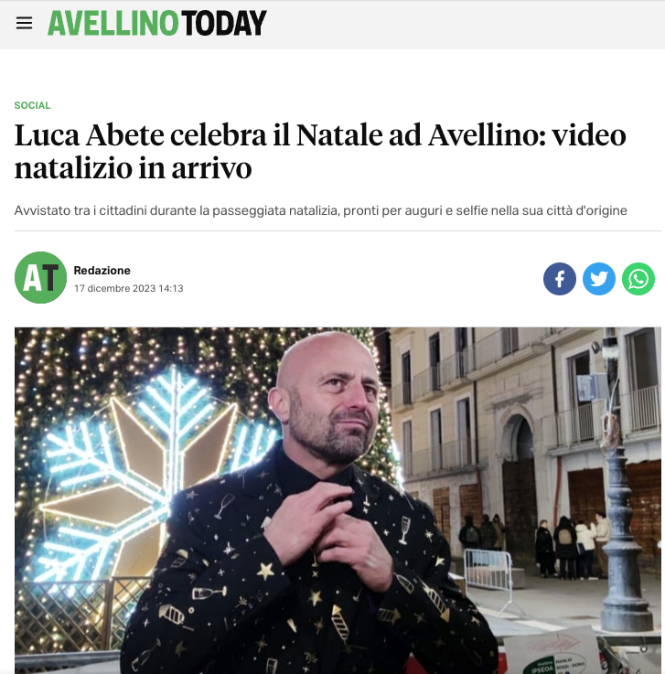 Luca Abete celebra il Natale ad Avellino: video natalizio in arrivo! Avvistato tra i cittadini durante la passeggiata natalizia, pronti per auguri e selfie nella sua città d'origine. Ieri sera Luca Abete è stato avvistato con la sua troupe ad Avellino dai numerosi cittadini intenti a fare shopping per il Corso cittadino. Sembra che Abete stesse registrando un video di Natale nella sua città che prossimamente sarà diffuso suo social network. Non sono mancati i tanti selfie e gli scambi di auguri con i suoi concittadini.